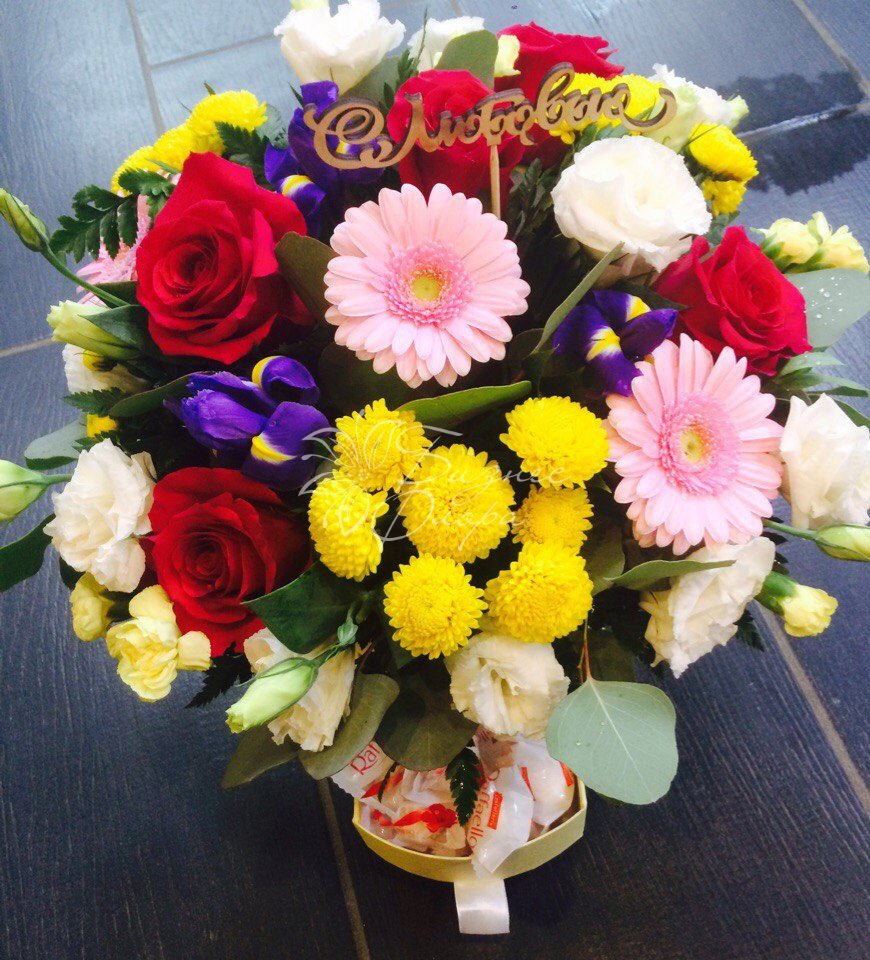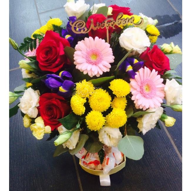 Красочная композиция в шляпной коробке с мини герберами, желтыми как одуванчиками хризантемой и ароматными розовыми розами, в сочитании с синим ирисом