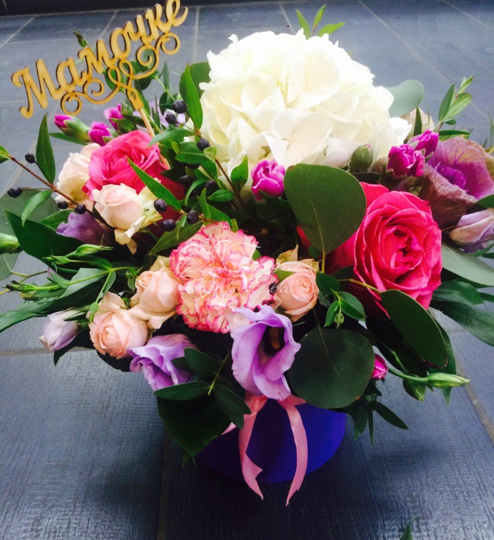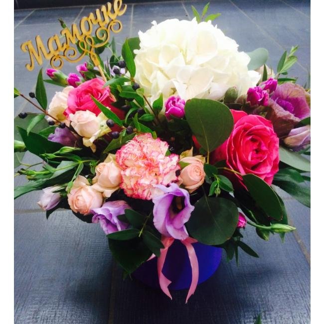 Нежная композиция в шляпной коробке с белой гортензией ,фиолетовой брасикой и розовыми розами,Композиция просто шикарна.Топпер может быть заменен на любой другой