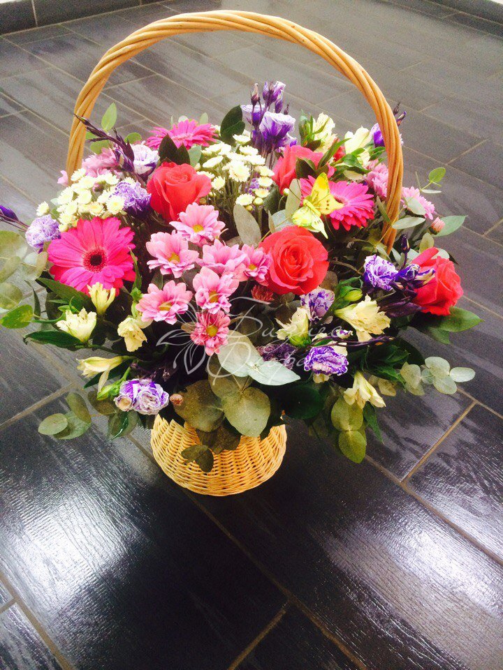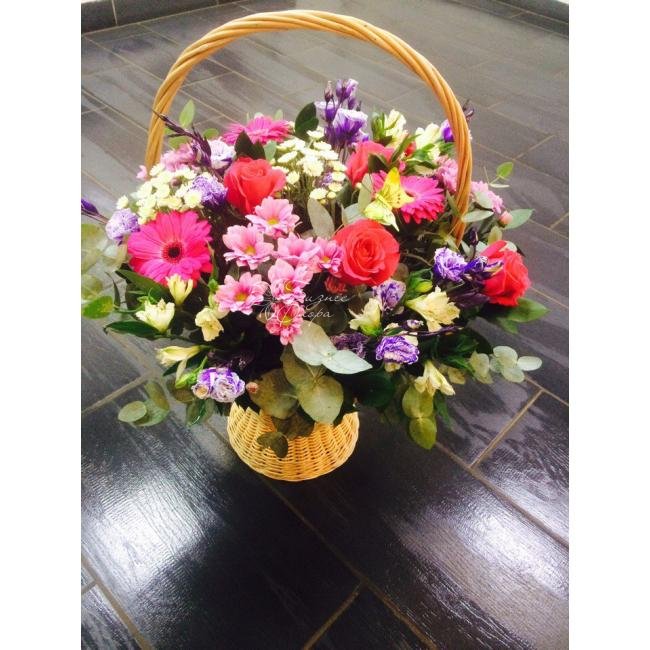 Оригинальная композиция в плетеной корзине с розовыми герберами, бело-синей эустомой и розовой хризантемой