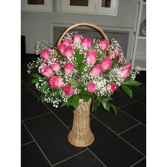 Праздничная ,яркая композиция в корзине из розовых роз,гипсофилы и с декоративной зеленью
